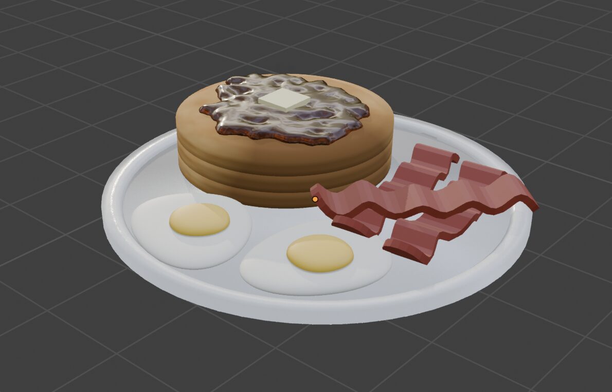 Modeled and colored 3D models of the breakfast plate, pancakes, and sides.