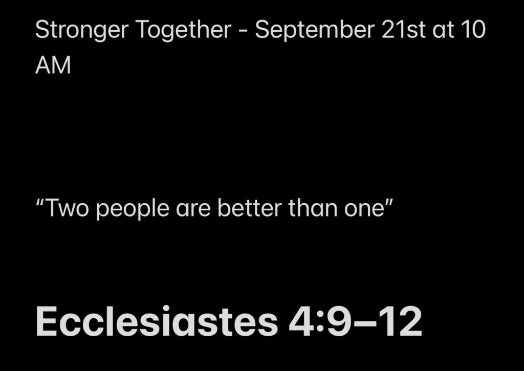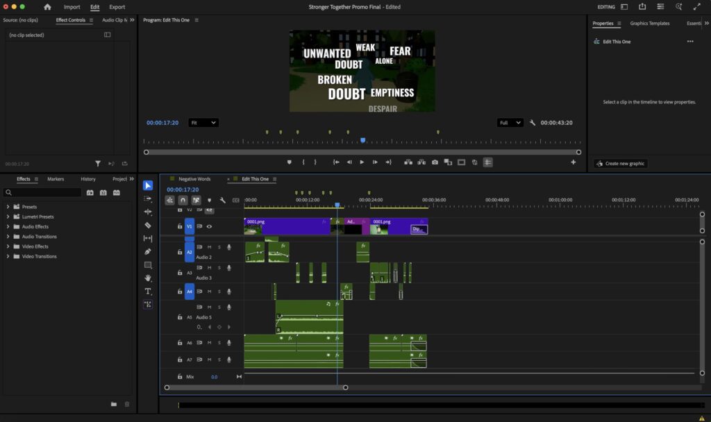 I received a brief summary of the sermon including the title, key verses, focus, and the desired application. My Objective was to create a multimedia video to promote one of Life Community Church’s upcoming sermons. With that information I was able to create this video that shows how we are stronger together than we are alone.