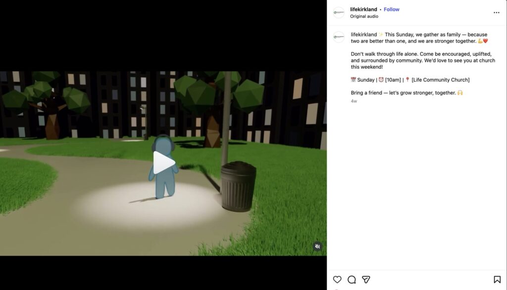 A blend of 3D environment design, 2D animation, and motion graphics, this piece explores how visual storytelling can express community and strength. Designed for Life Community Church, the finished video was featured on their social media to encourage engagement with the Stronger Together message.